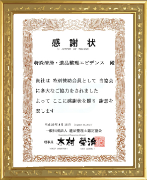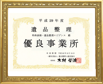 遺品整理士 : 第IS09366号 生前整理技能pro1級 : 第S01-01012号 事件現場特殊清掃士 : 第CSC02384号 脱臭マイスター認定 : 第M-0241号 孤独死脱臭マイスター : 第K-0088号 |