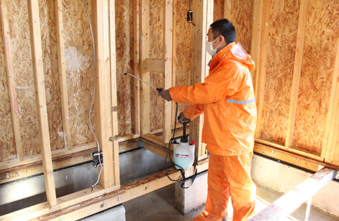 気体ですので床下で体が入らない場所や閉所などにも効果があります。